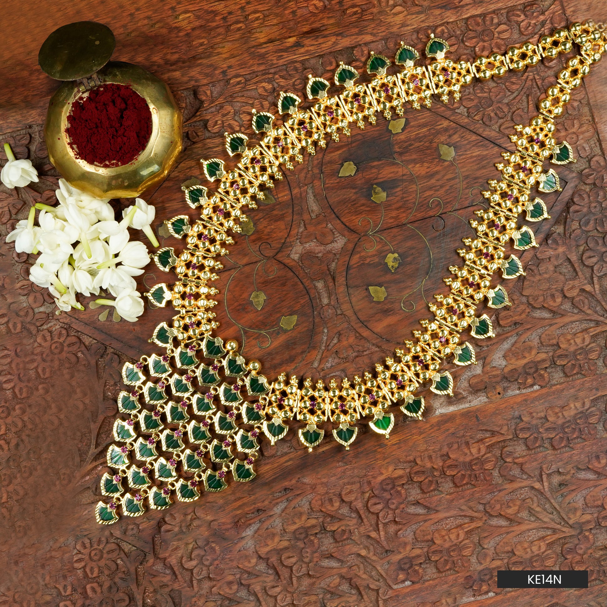 Embodying the grandeur of South Indian heritage, this exquisite Temple Necklace is a stunning fusion of tradition and craftsmanship. Intricately handcrafted, the neckpiece features a detailed arrangement of gold-tone motifs inspired by sacred peepal leaves, elegantly inlaid with deep green enamel work and accented with tiny ruby-colored stones. The symmetrical layering at the center creates a bold yet graceful look, ideal for bridal wear or festive occasions. Pair this statement piece with a silk saree or traditional attire for an unmatched regal charm.