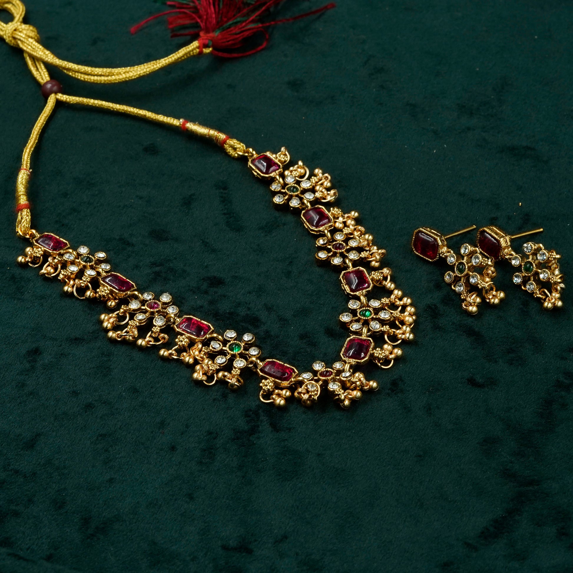 Indulge in timeless grace with the Heritage Ruby Cluster Necklace Set, a masterpiece of traditional South Indian design. This elegant necklace showcases rectangular ruby-red stones, alternating with white kundan-style accents, all set in an antique gold base. Dangling gold beads add movement and richness, creating a regal silhouette. Paired with coordinating earrings that mirror the necklace’s central motif, this set by Ishwari Store is a perfect choice for weddings, festive gatherings, and temple ceremonies. A tribute to classic beauty and cultural elegance.