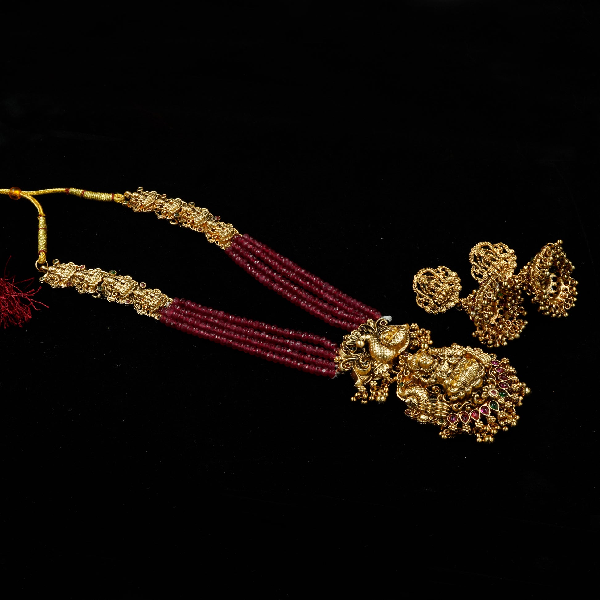 Exude traditional grandeur with the Padmavathi Antique Lakshmi Haaram Set, a divine masterpiece that features a majestic Lakshmi Devi pendant intricately handcrafted in antique gold finish. The pendant is adorned with detailed motifs of peacocks and temple architecture, exuding timeless charm. Strung with luxurious deep maroon beads and finished with ornate gold-toned connectors, this set is perfect for weddings, festivals, and auspicious occasions. Paired with matching Lakshmi jhumkas embellished with delicate red stones and bead hangings, this set celebrates South Indian temple jewellery heritage with elegance and grace.