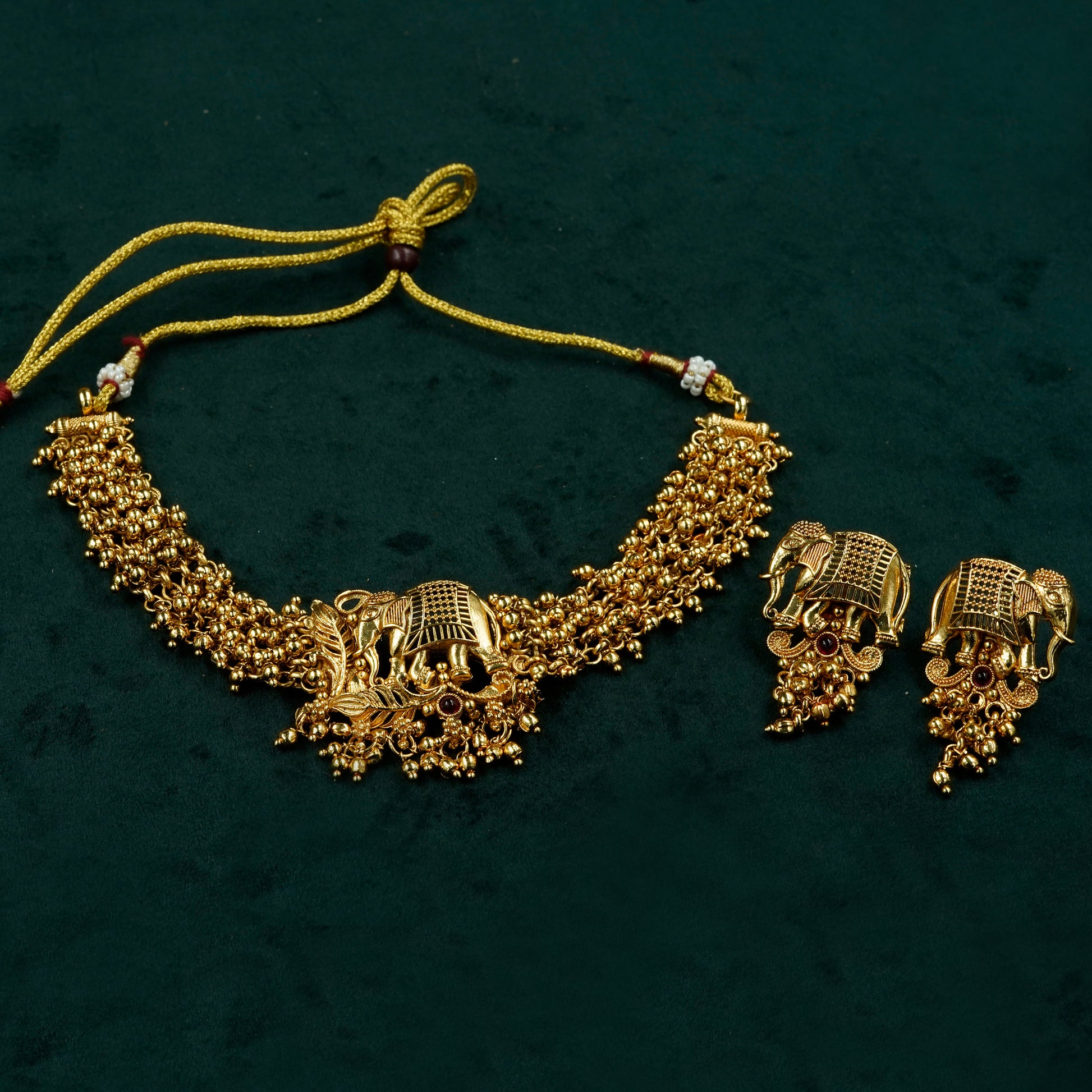 Embrace the grandeur of traditional elegance with this antique gold-finish choker set from Ishwari Store. The highlight of the design is a beautifully sculpted elephant motif centerpiece, symbolizing strength and prosperity. Adorned with intricate detailing and delicate bead danglings, the choker exudes a royal vintage charm. Matching stud-style earrings with cascading beads mirror the central design, completing the set. Ideal for festive occasions and cultural ceremonies, this piece blends heritage artistry with regal sophistication.