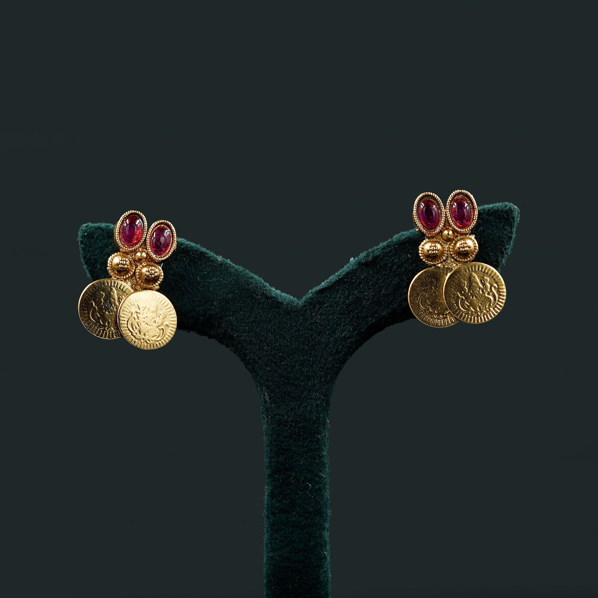 The Rajashree Kasu Coin Necklace Set is a traditional South Indian jewellery masterpiece, featuring a stunning arrangement of intricately embossed kasu (coin) motifs. Accented with rich ruby-red stones, this elegant neckpiece reflects the timeless charm of temple jewellery. The matching earrings mirror the coin design with a delicate pop of ruby stones, making it a perfect choice for weddings, festivals, and classical occasions. An exquisite blend of heritage and sophistication, this set brings a royal touch to any ethnic ensemble.