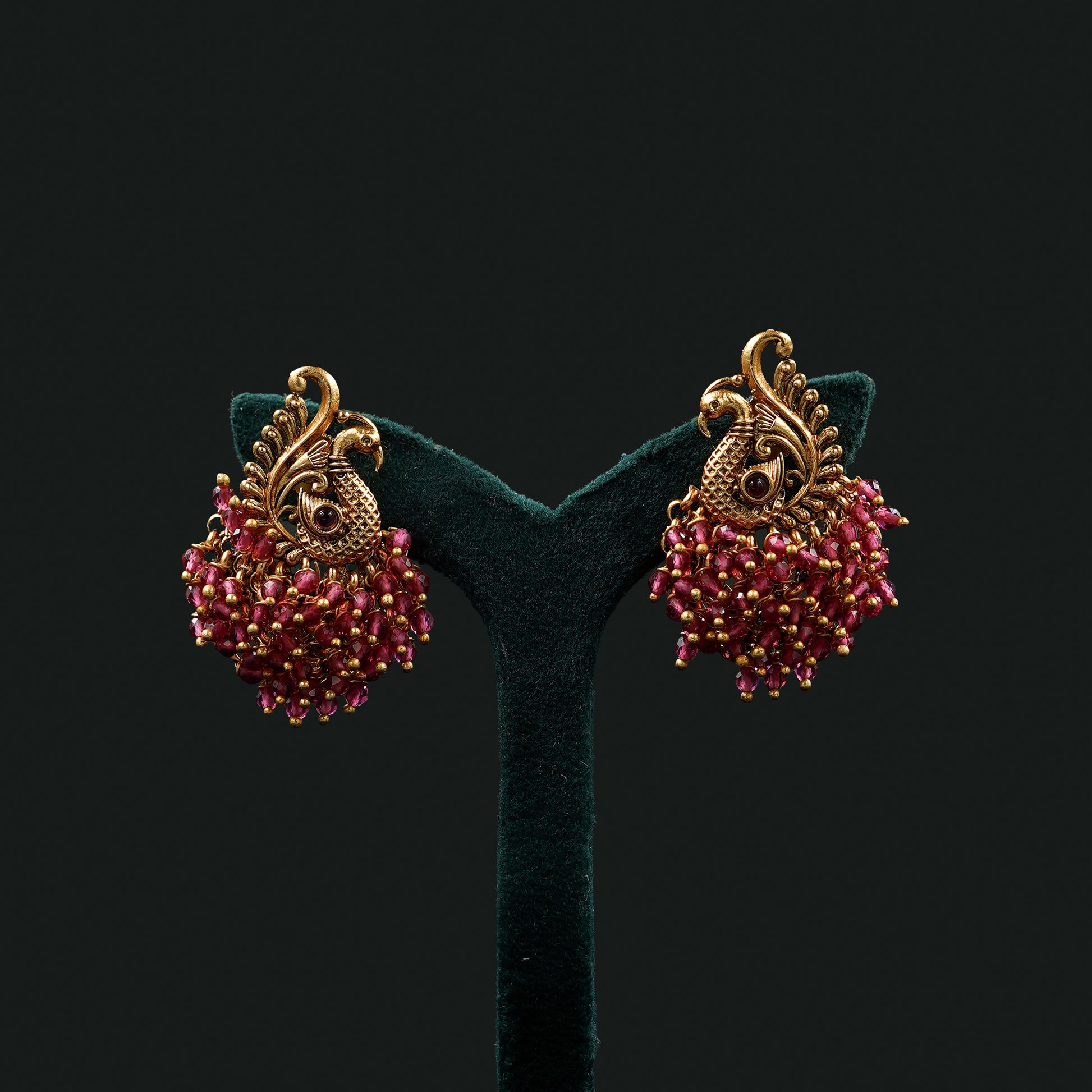 This exquisite temple jewelry set from Ishwari Store features a regal peacock design, symbolizing beauty and elegance. The necklace is intricately adorned with rich pink beads and antique gold-tone detailing, creating a striking yet traditional look. Complemented by matching earrings, the set beautifully showcases classic South Indian craftsmanship, making it ideal for festive occasions, weddings, and cultural celebrations. The PJ8N set blends intricate artistry with timeless temple jewelry aesthetics, perfect for those seeking elegance with a traditional touch.