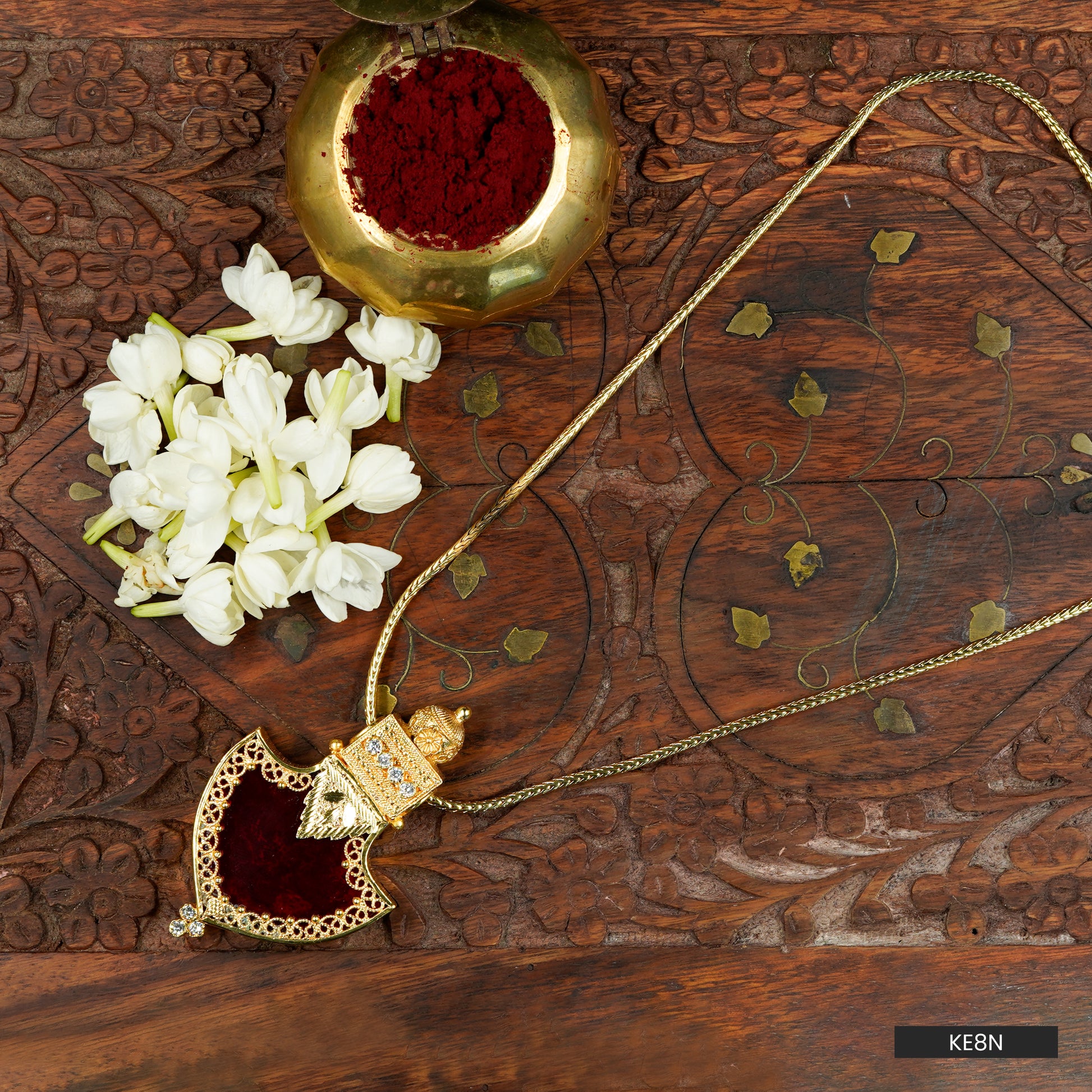 An elegant fusion of Kerala heritage and royal craftsmanship, the Ruby Red Nettichutti Palakka Necklace features a radiant half-moon pendant in deep ruby red enamel. Adorned with traditional gold filigree work and sparkling white stone accents, the pendant is suspended from a sleek antique-finish braided chain. Inspired by temple ornaments and bridal forehead jewelry (nettichutti), this necklace adds a regal touch to sarees and festive attire, making it a graceful addition to any ethnic wardrobe.